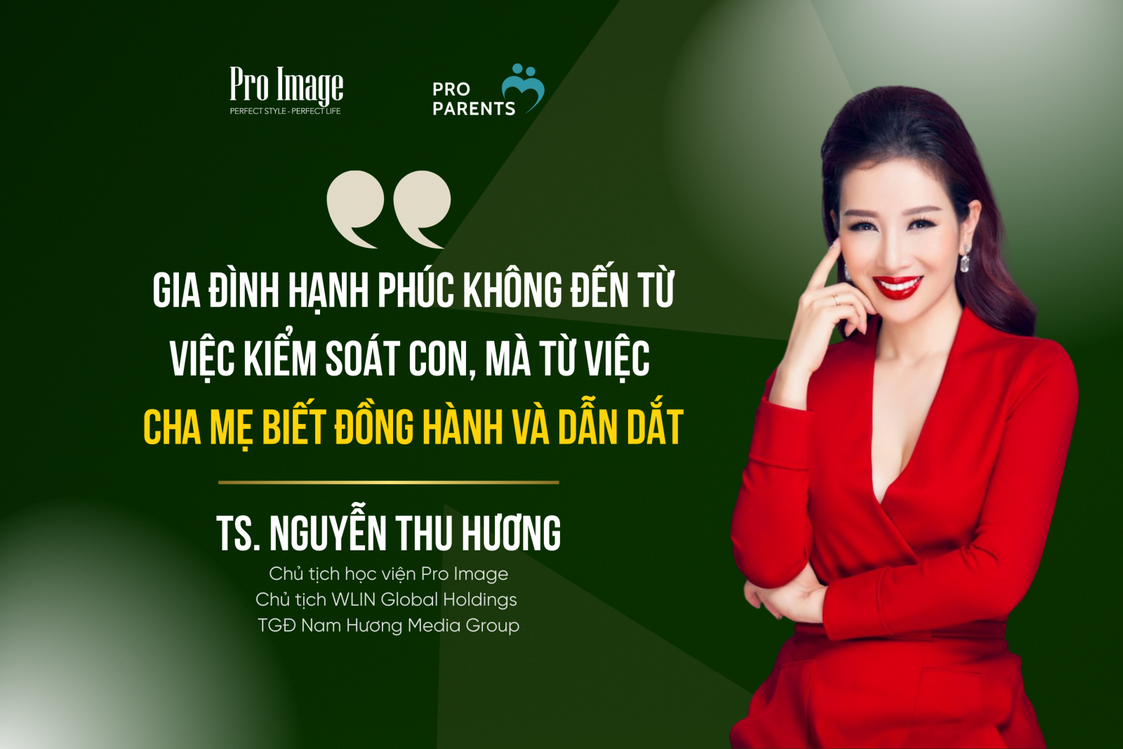 Chương trình được trực tiếp dẫn dắt bởi TS. Nguyễn Thu Hương, chuyên gia có nhiều năm kinh nghiệm trong lĩnh vực đào tạo phát triển con người và xây dựng thương hiệu, nhân hiệu cho các lãnh đạo, doanh nhân của nhiều Tập đoàn, doanh nghiệp lớn; đồng thời là Chủ tịch Học viện Pro Image, CEO Nam Hương Media Group. Với nền tảng kiến thức sâu rộng cùng trải nghiệm thực tiễn trong việc đồng hành cùng hàng nghìn doanh nhân và gia đình, chị chắc chắn sẽ mang đến một góc nhìn toàn diện về việc làm cha mẹ trong thời đại mới, nơi tình yêu thương cần đi cùng phương pháp, và sự kỷ luật cần song hành với sự thấu hiểu. Thông qua khóa học, phụ huynh không chỉ tiếp cận những nguyên tắc cốt lõi về tâm lý trẻ em mà còn được hướng dẫn cách áp dụng vào thực tế đời sống, từ việc giao tiếp với con, xử lý xung đột đến xây dựng môi trường phát triển tích cực cho trẻ.