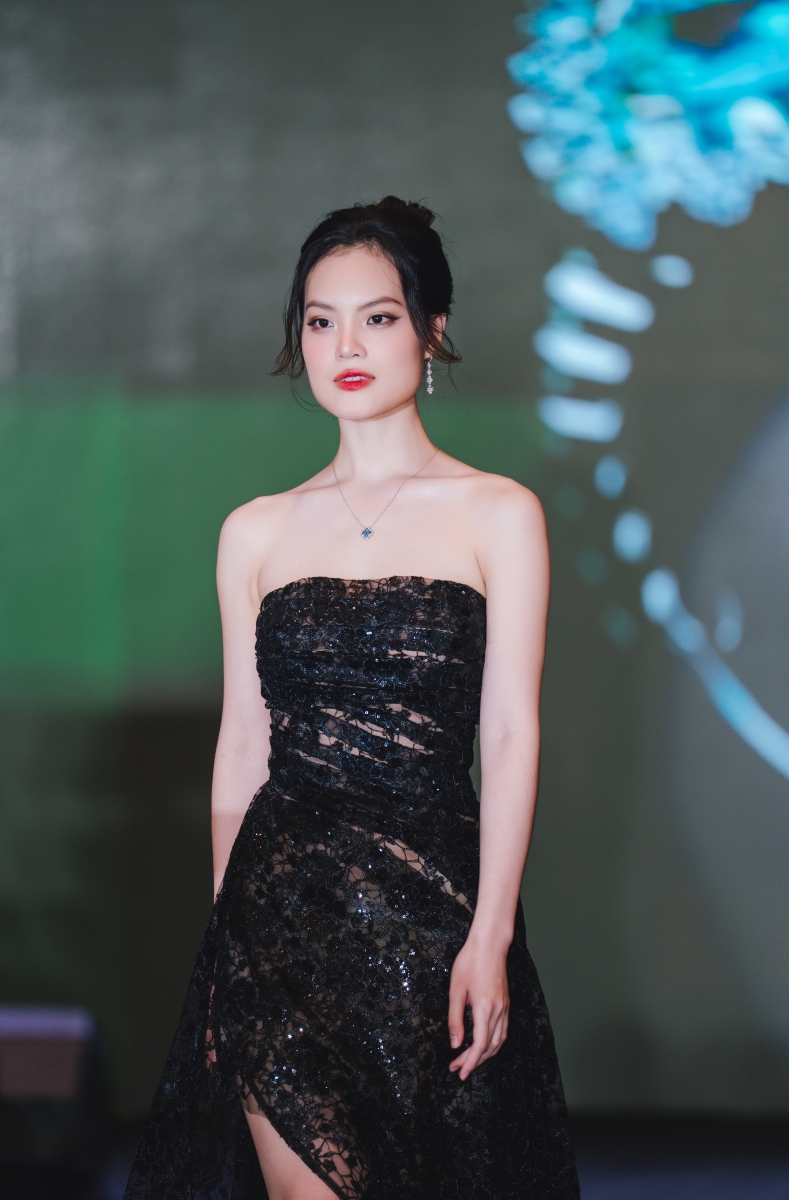 Nguyễn Minh Anh trình diễn thiết kế kim cương thanh lịch, tối giản, tôn vinh vẻ đẹp trong trẻo và tinh thần trách nhiệm của thế hệ kế thừa. Ánh sáng kim cương đại diện cho sự tiếp nối bền vững và những giá trị được gìn giữ qua thời gian
