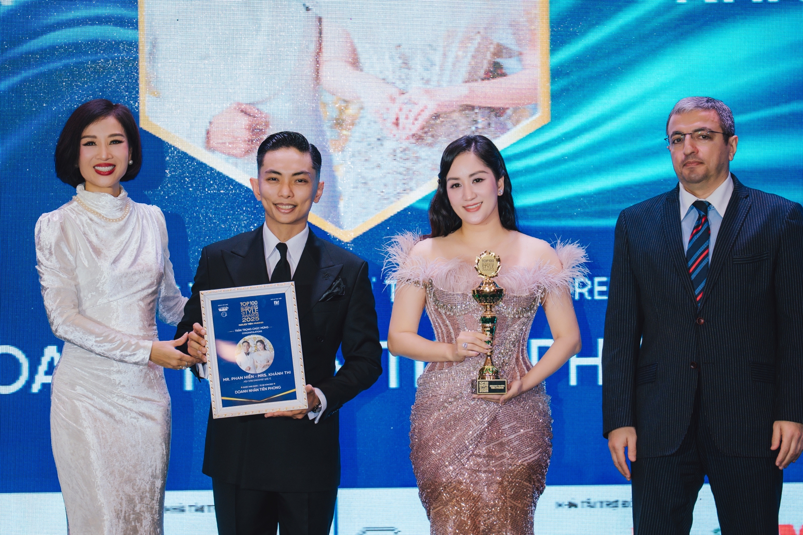 Cặp đôi kiện tướng dancesport quốc tế Phan Hiển - Khánh Thi nhận cúp vinh danh Doanh nhân tiên phong tại Top 100 Người tiên phong 2025